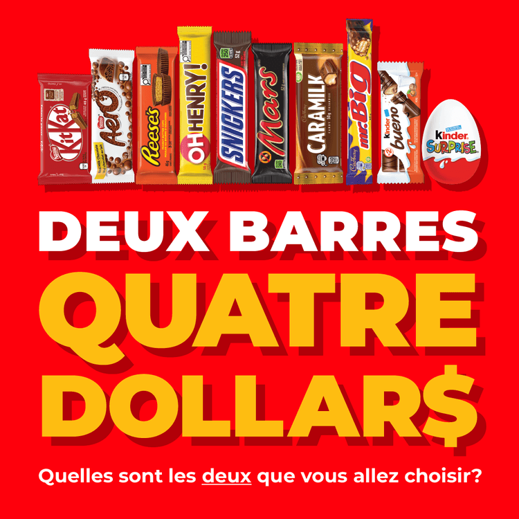 Deux fois plus de choco, deux fois plus de plaisir! Obtenez 2 barres de chocolat individuelles (20-60g) pour seulement 4 $. Passez en magasin pour profiter de cette offre géniale là où vous pouvez gagner les Récompenses Journie !