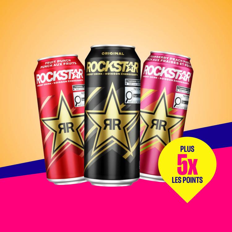 Obtenez 5X les points avec les boissons énergisantes Rockstar de 473 ml ! Achetez-en 2 pour 5,50 $ ou 3 pour 7 $ et faites le plein de récompenses plus rapidement.